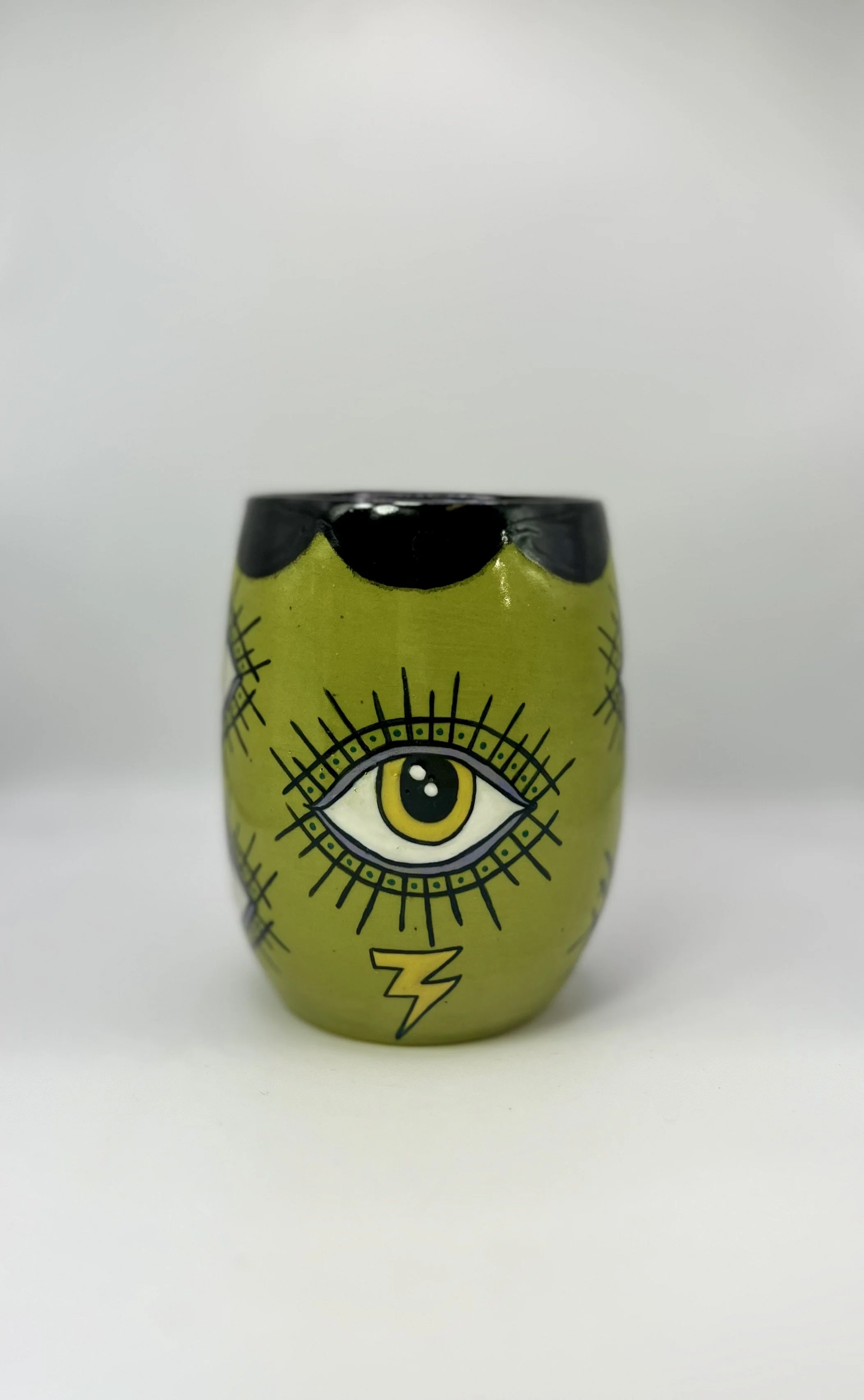 Wheel thrown and hand painted. This cup holds approximately 12 oz of liquid.