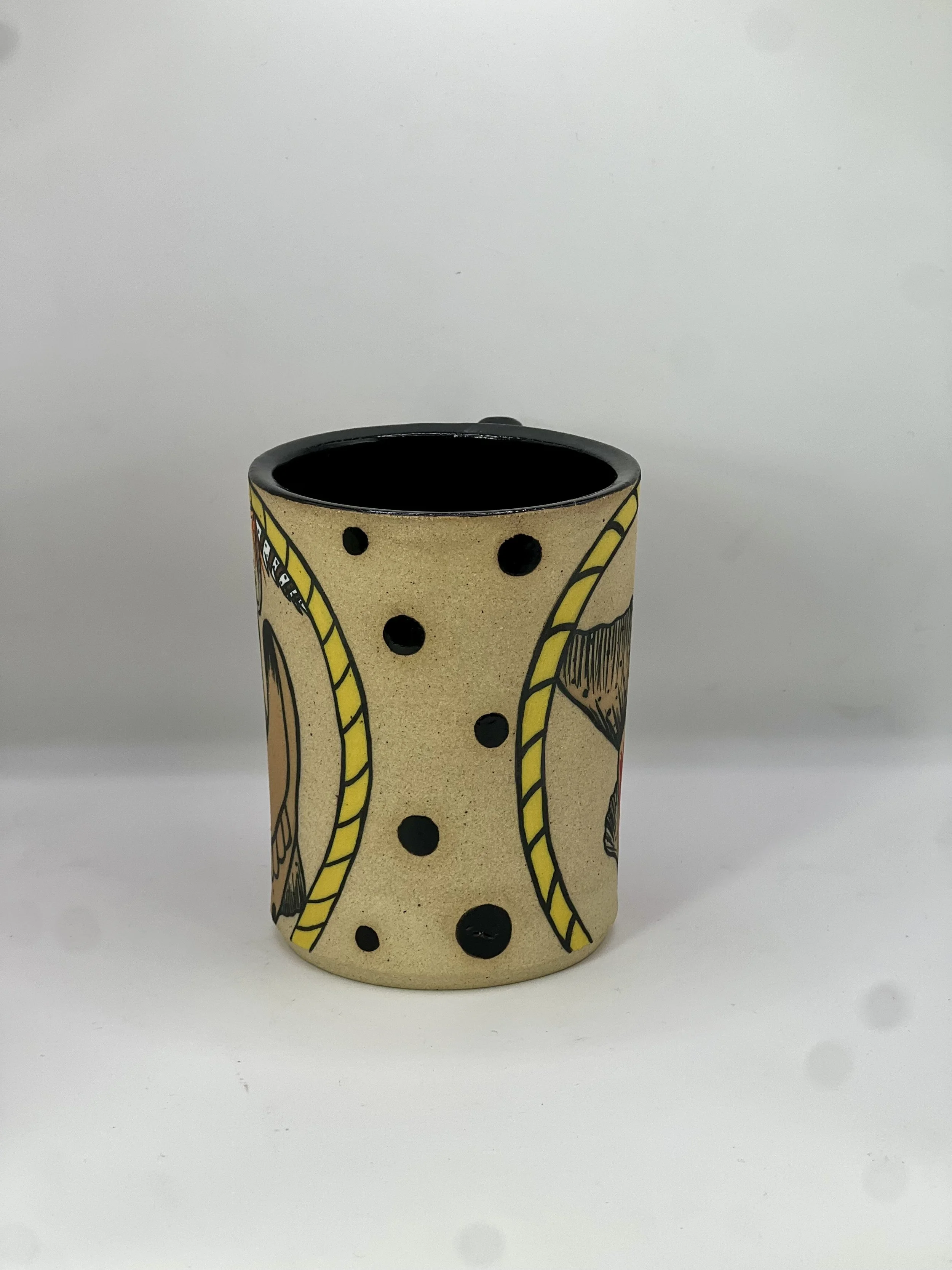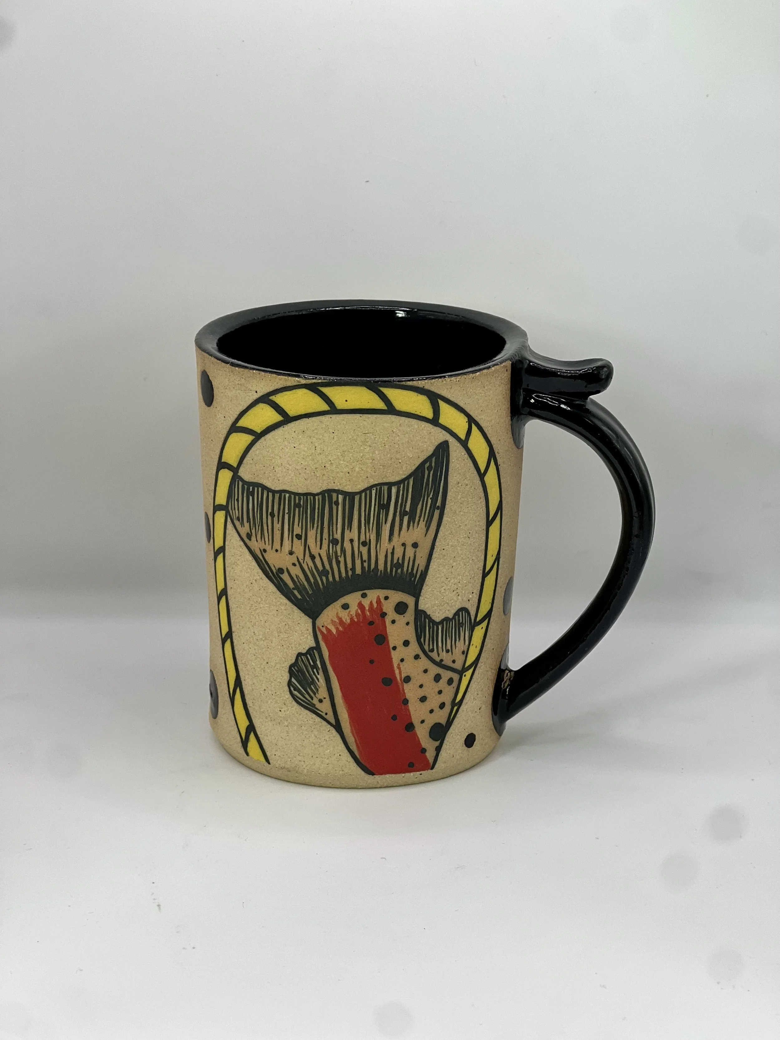 Wheel thrown and hand painted. This mug holds approximately 10 oz of liquid.