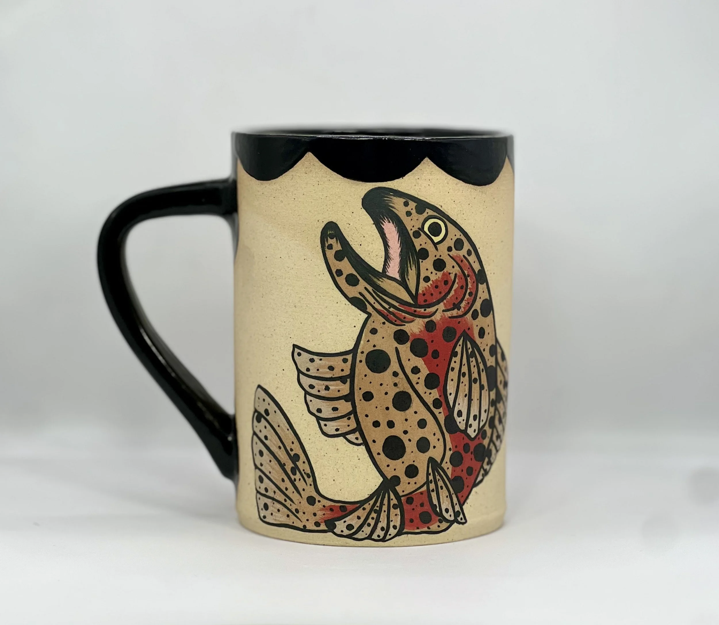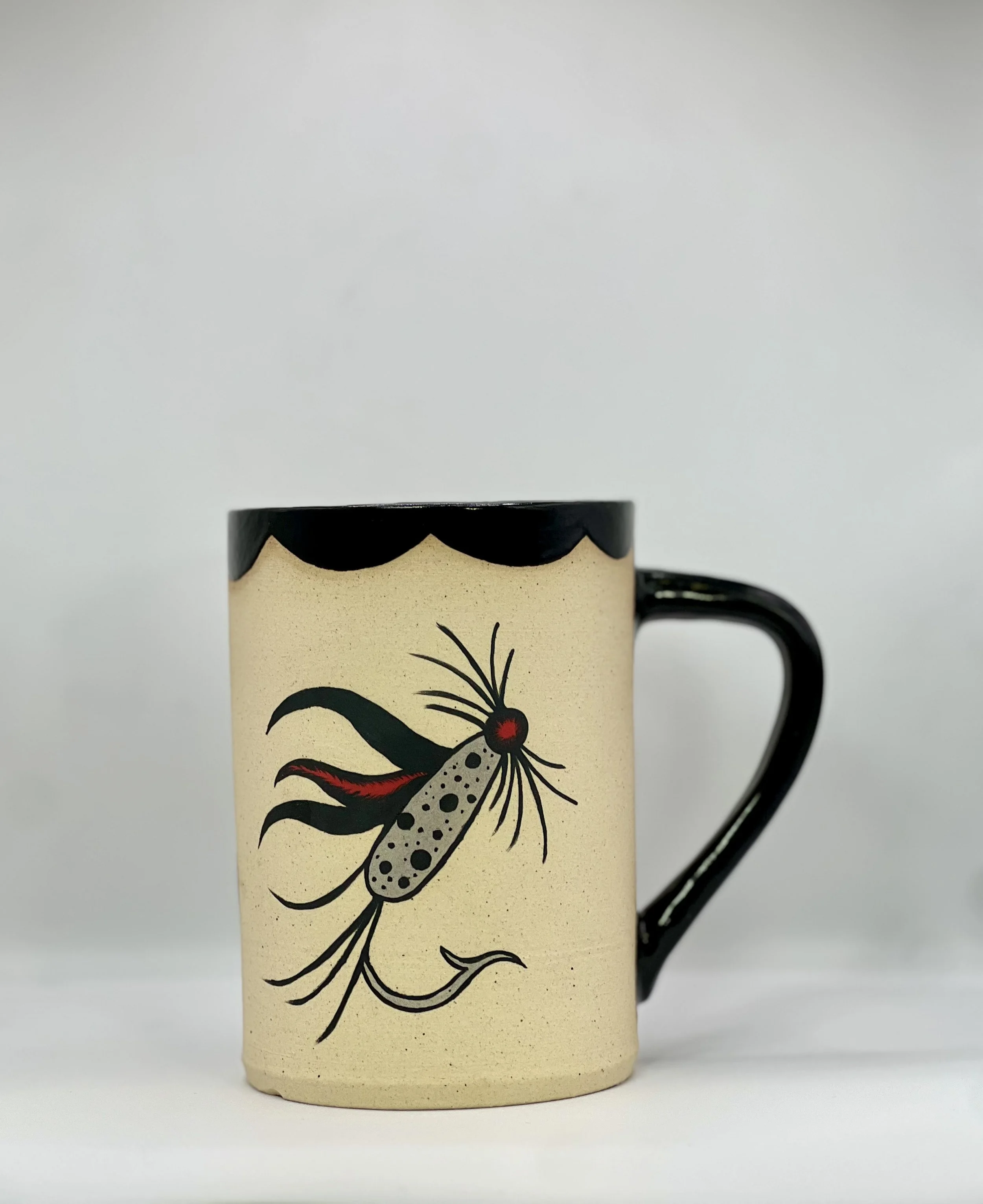 Wheel thrown and hand painted. This mug holds approximately 14 oz of liquid.