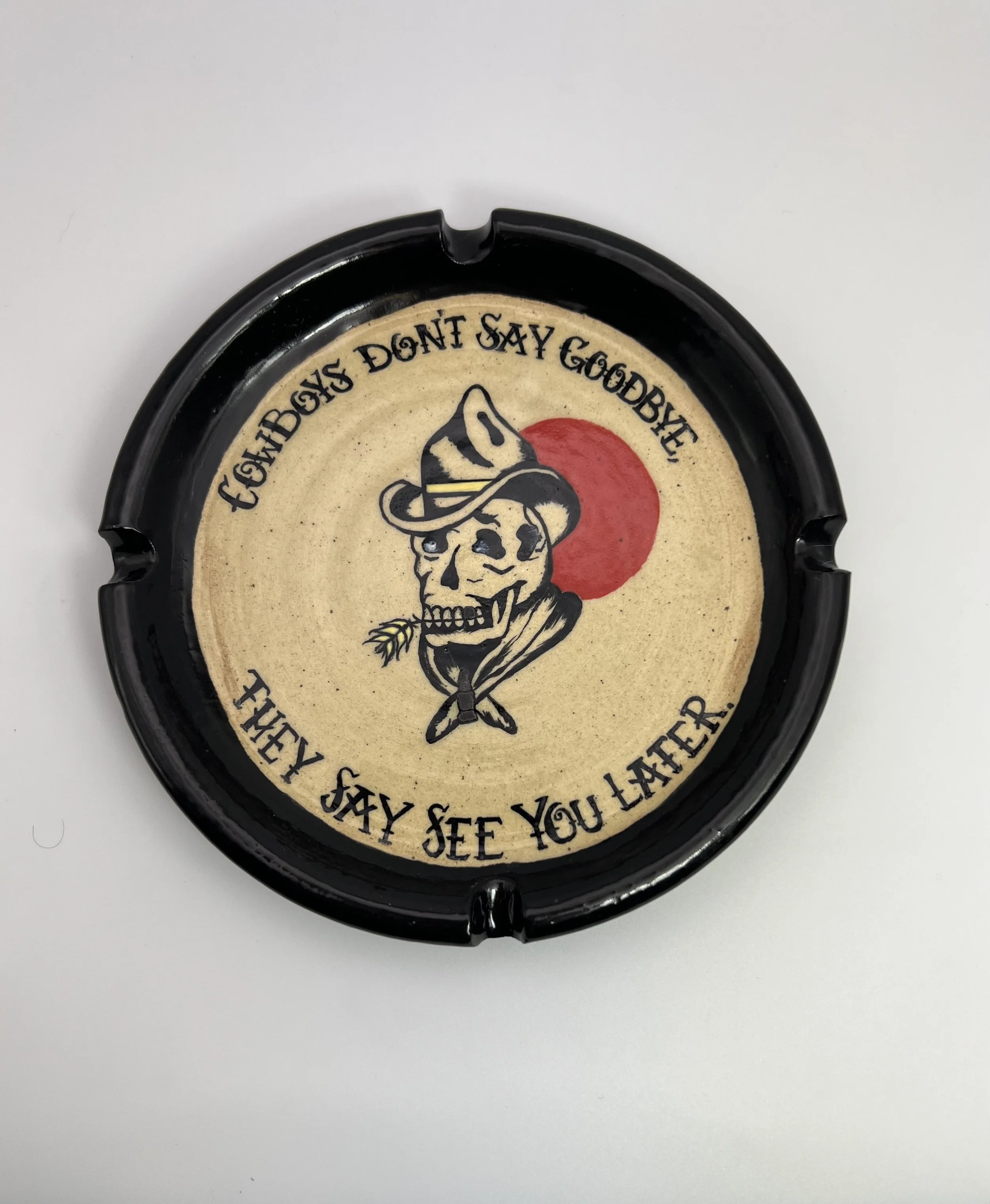 Wheel thrown and hand painted ashtray finished with a shiny black rimmed glaze. This piece was inspired by the Yellowstone quote by Rip Wheeler, "Cowboys don't say goodbye, they say see you later."