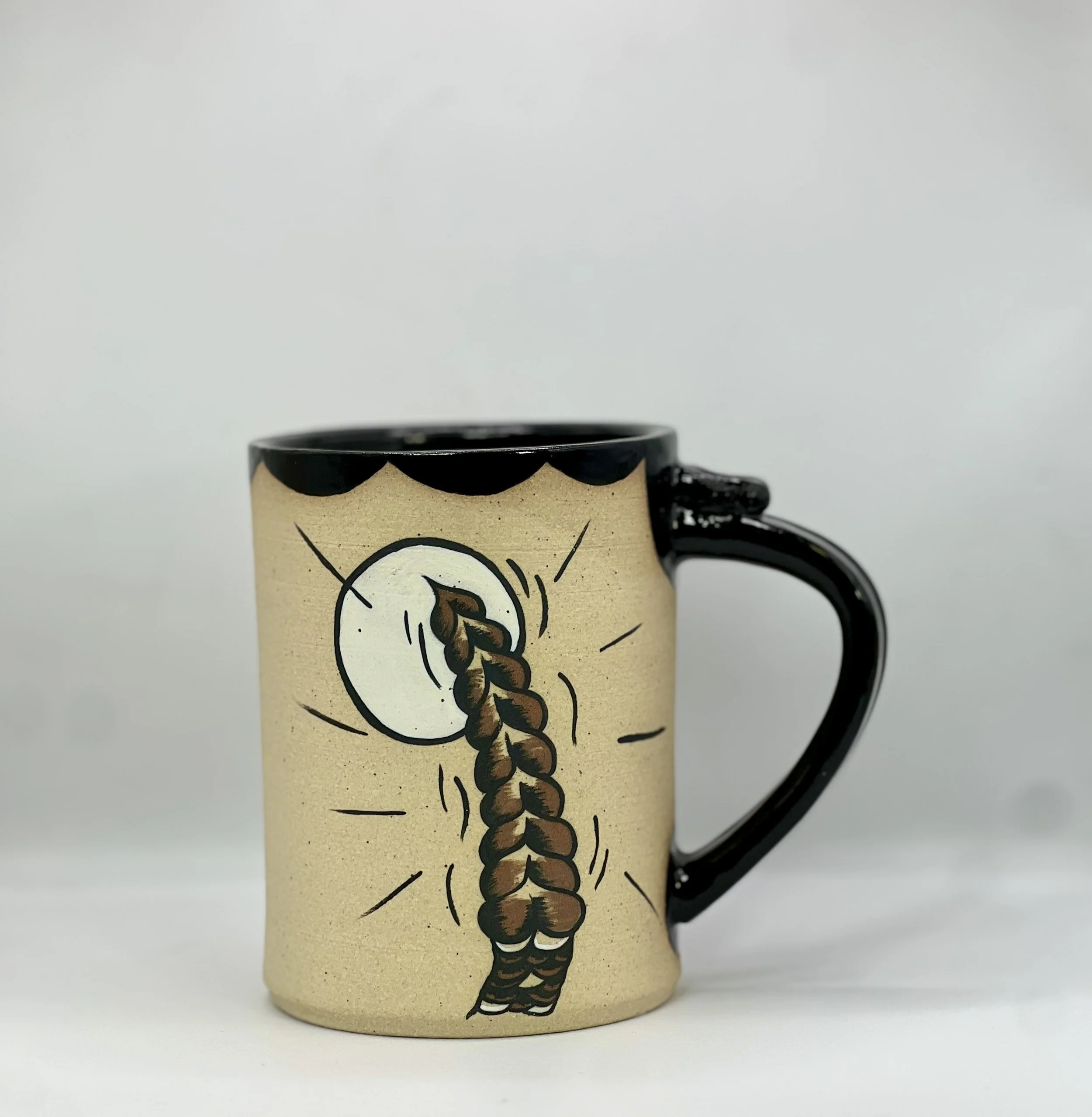 Wheel thrown and hand painted. This mug holds approximately 12 oz of liquid.