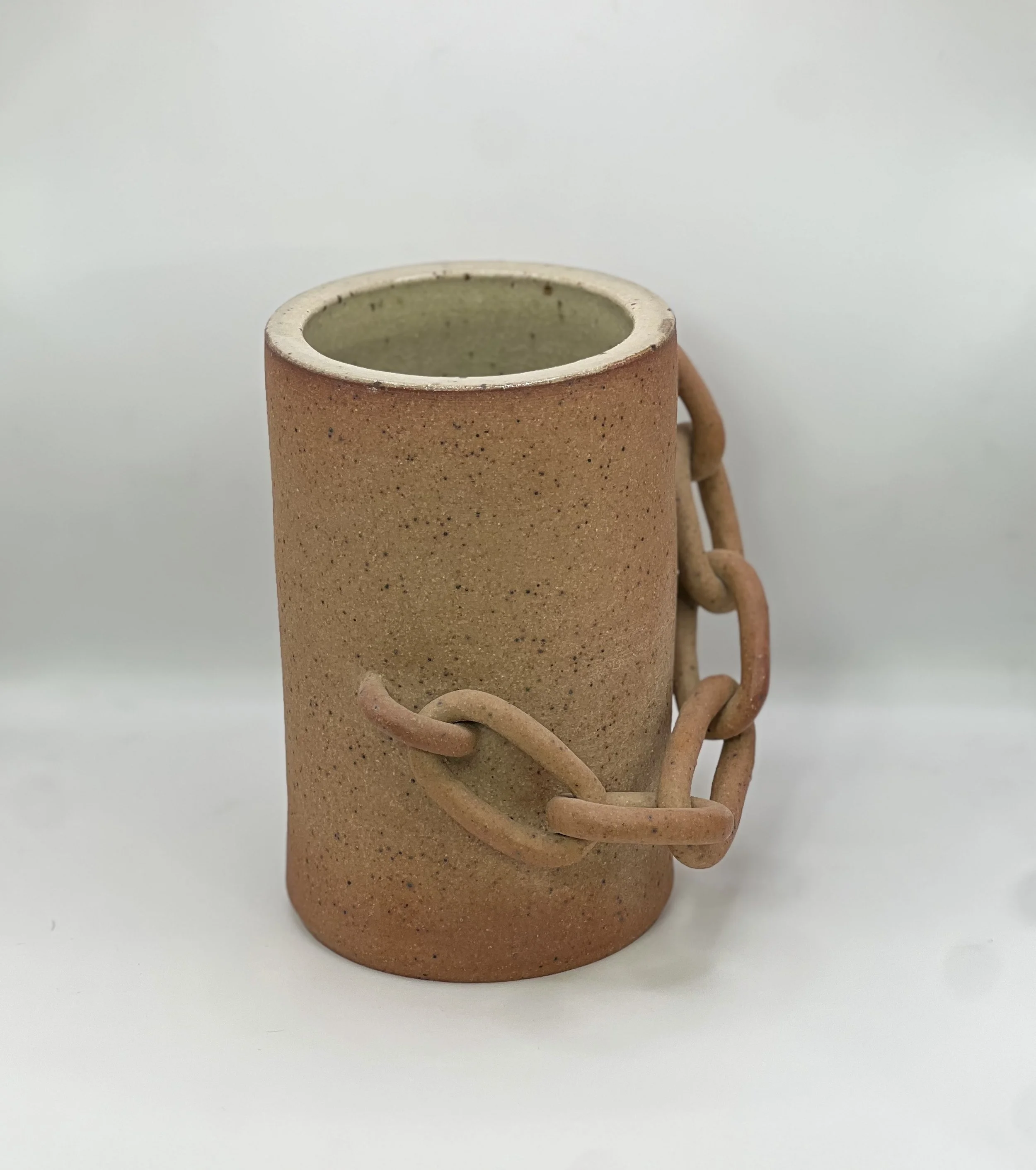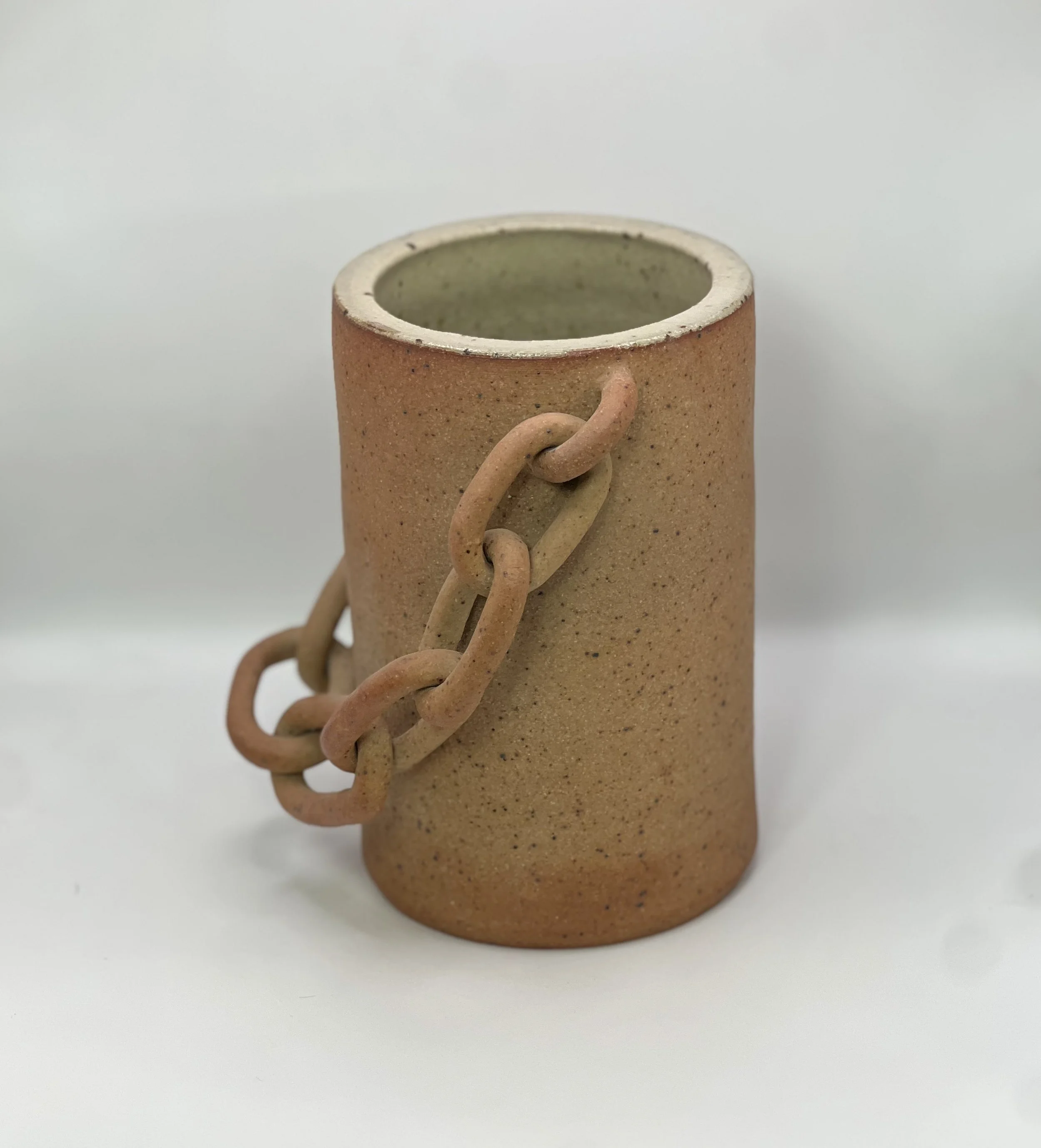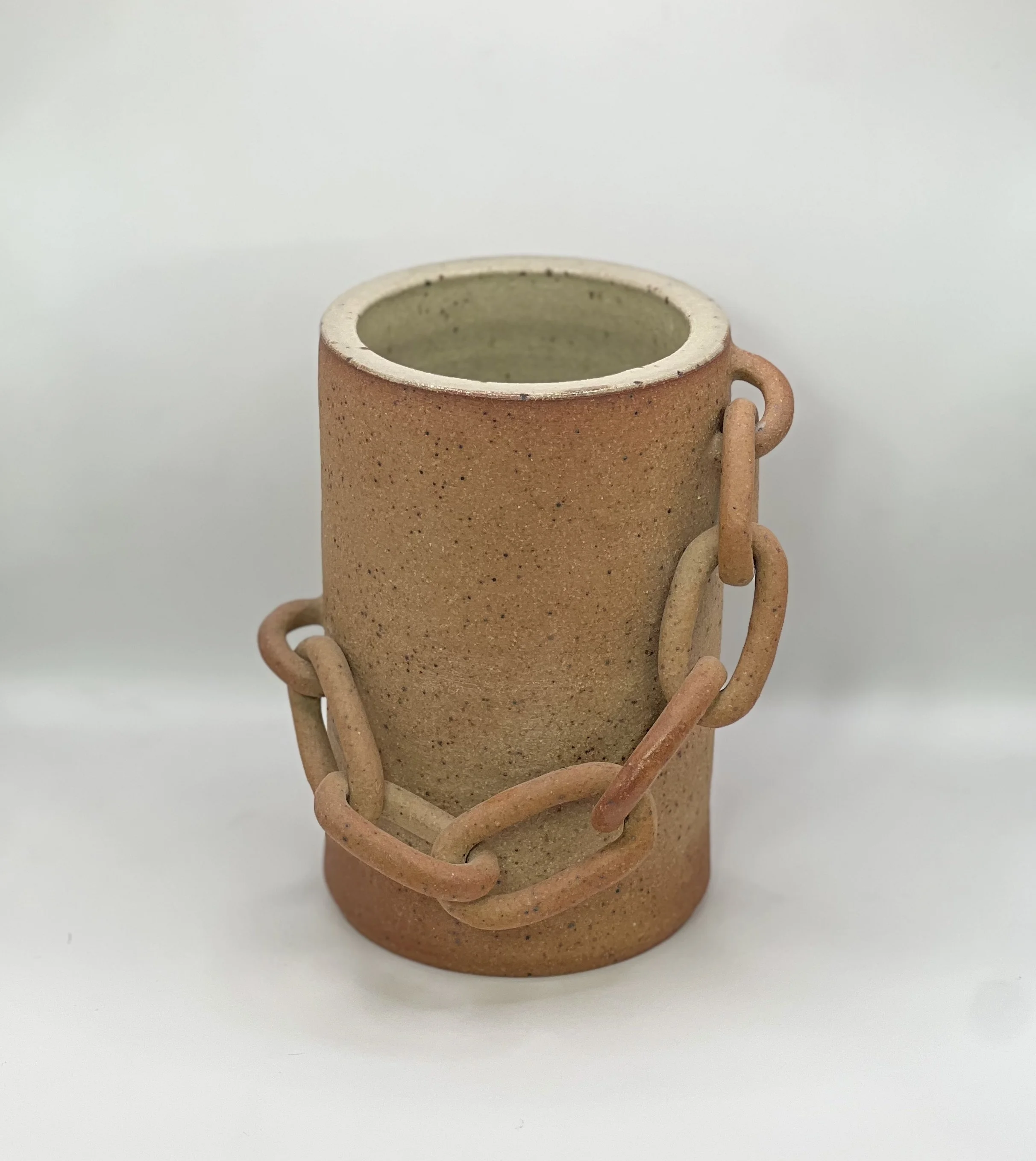 Wheel thrown vessel body with handmade, moveable chain links.