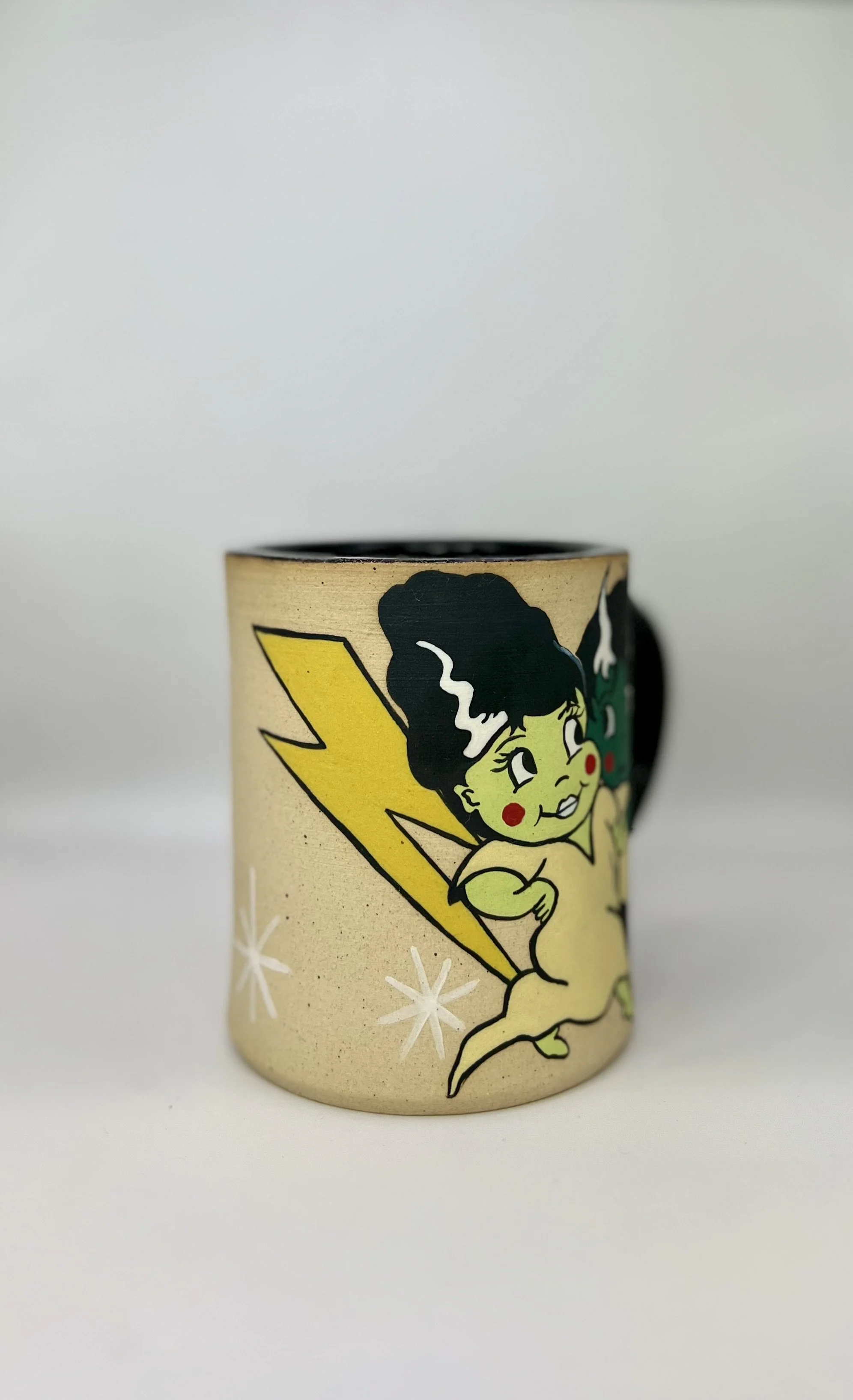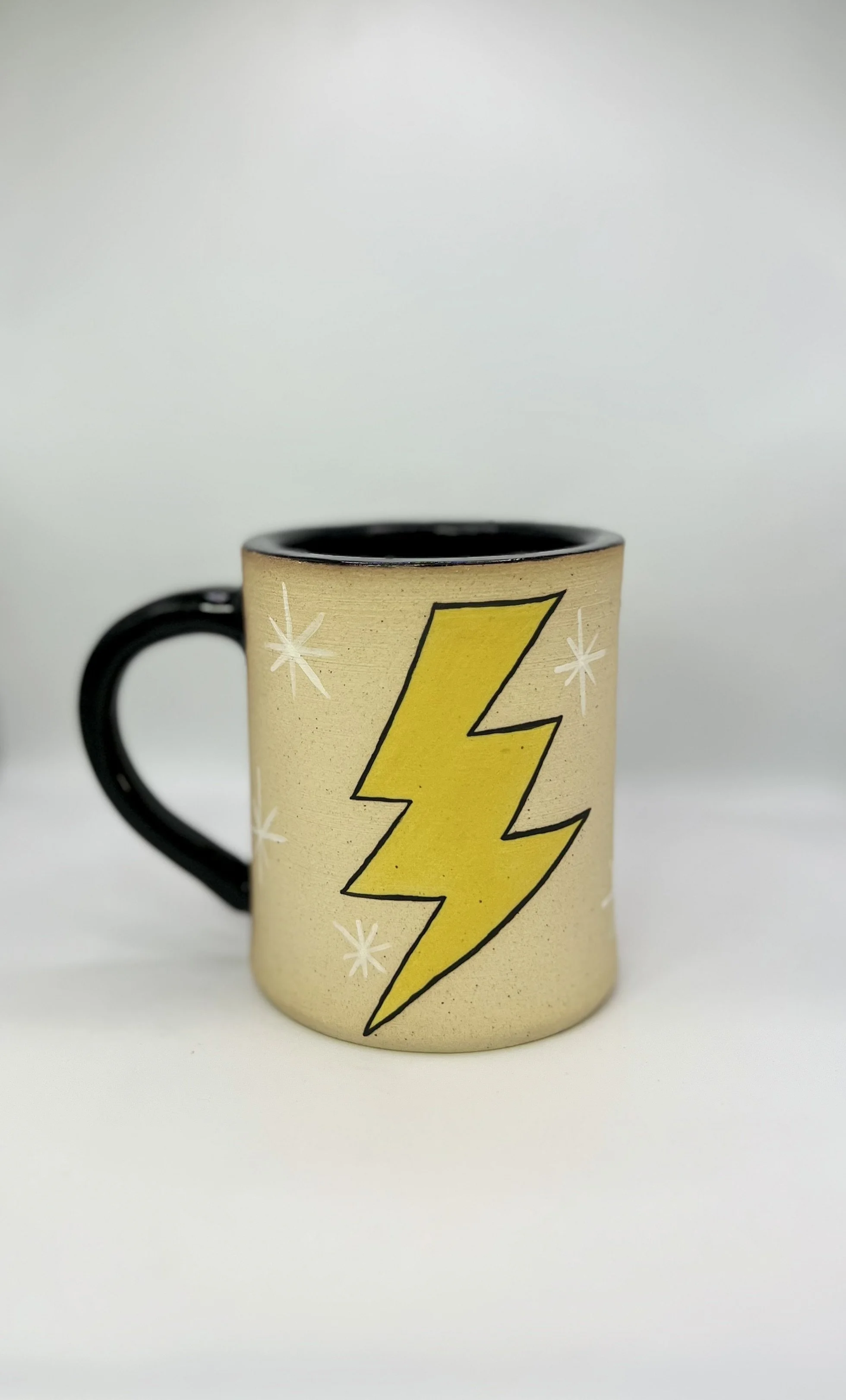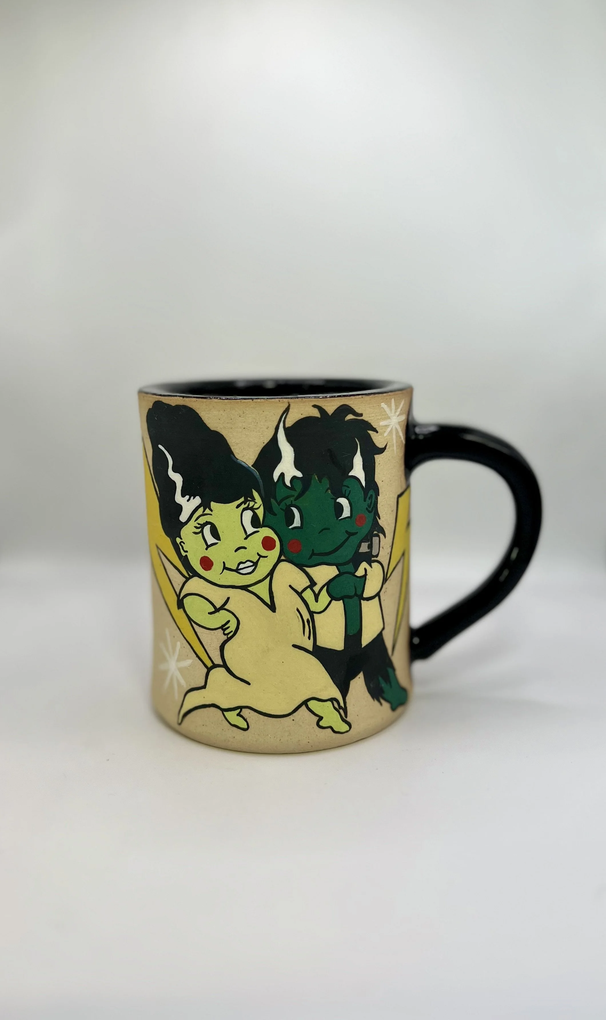 Wheel thrown and hand painted. This mug holds approximately 10 oz of liquid.