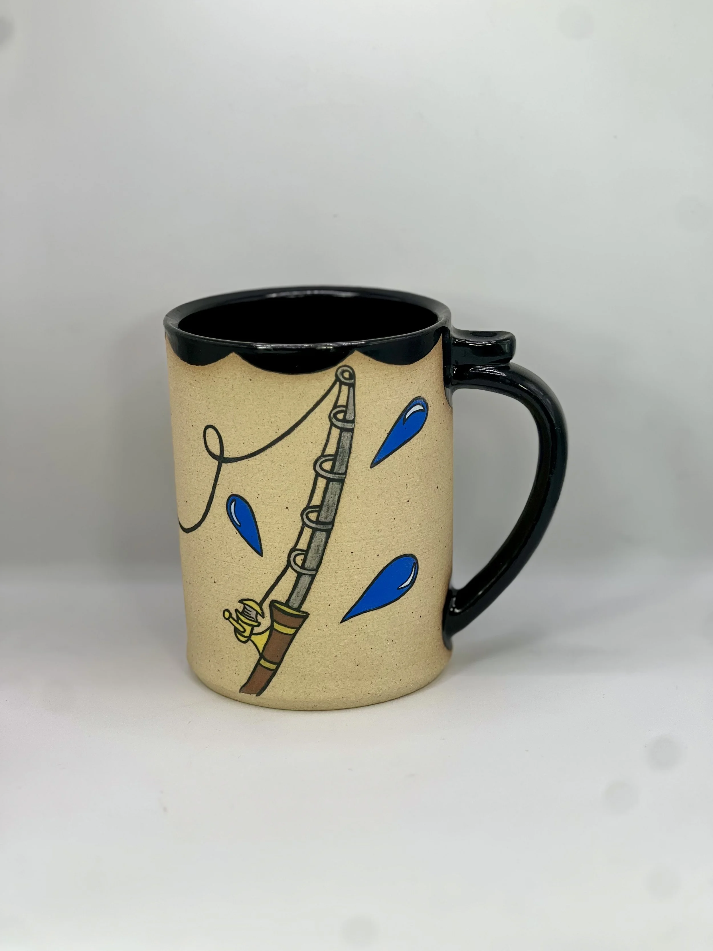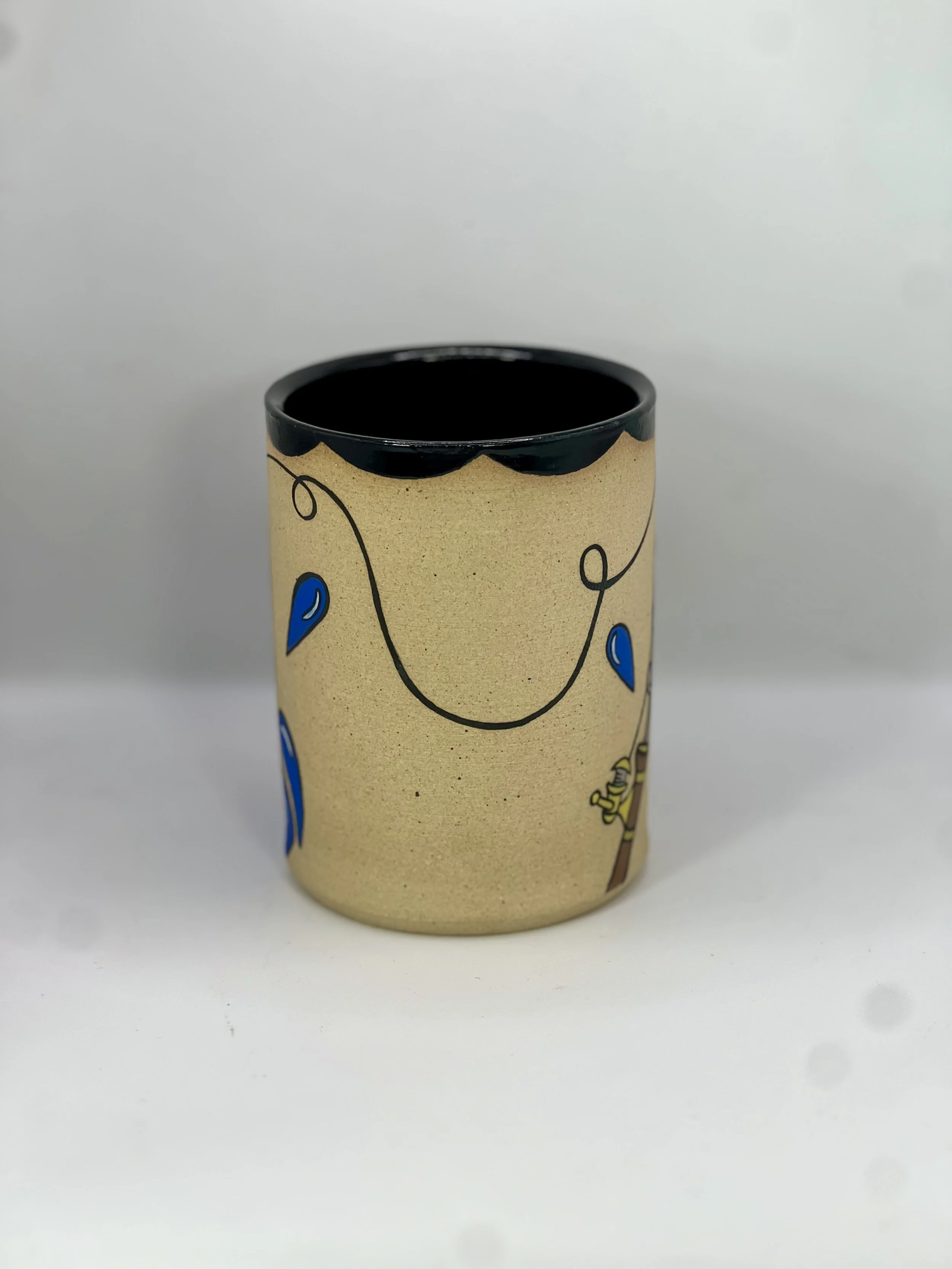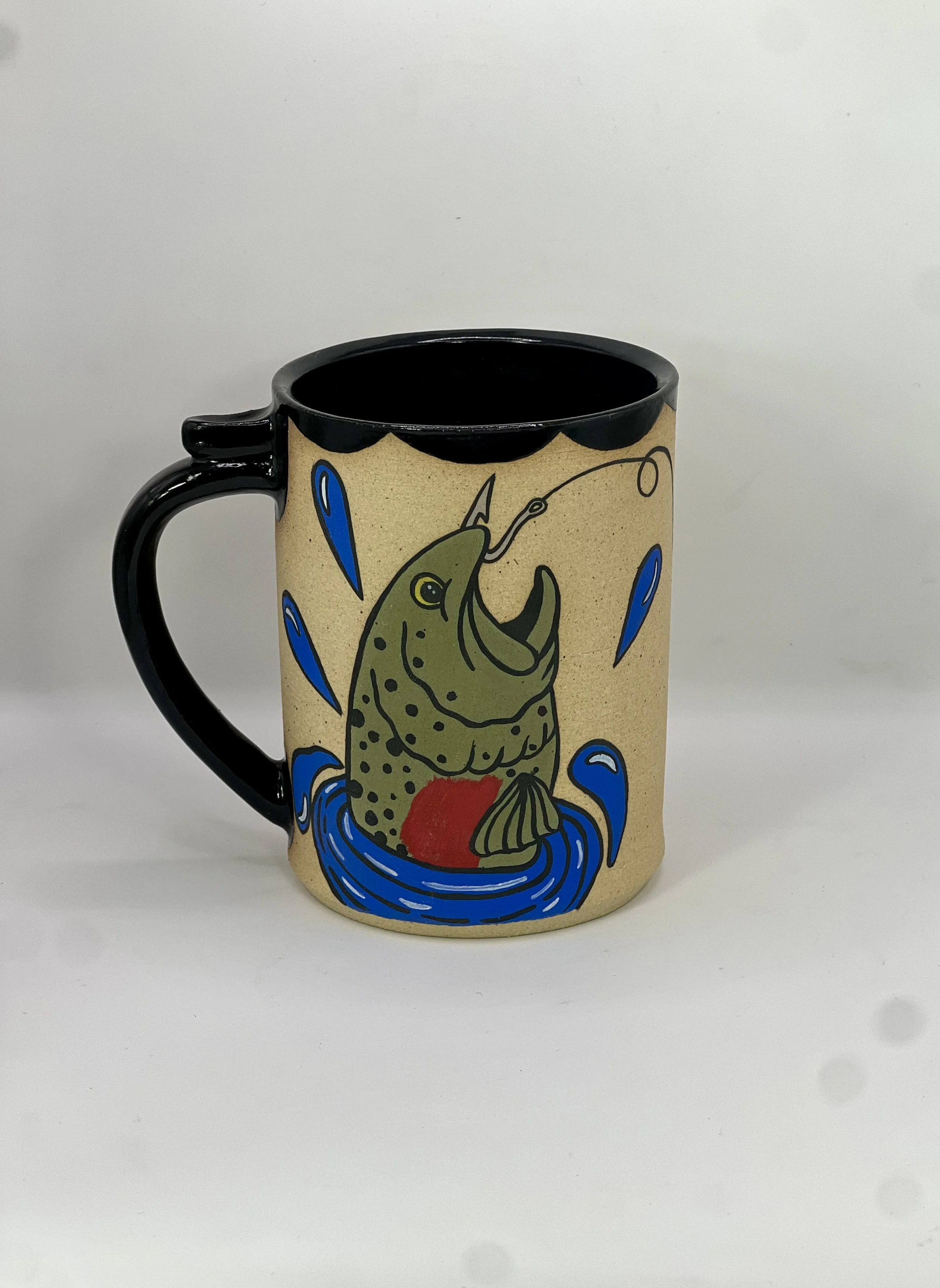 Wheel thrown and hand painted. This mug holds approximately 14 oz of liquid.