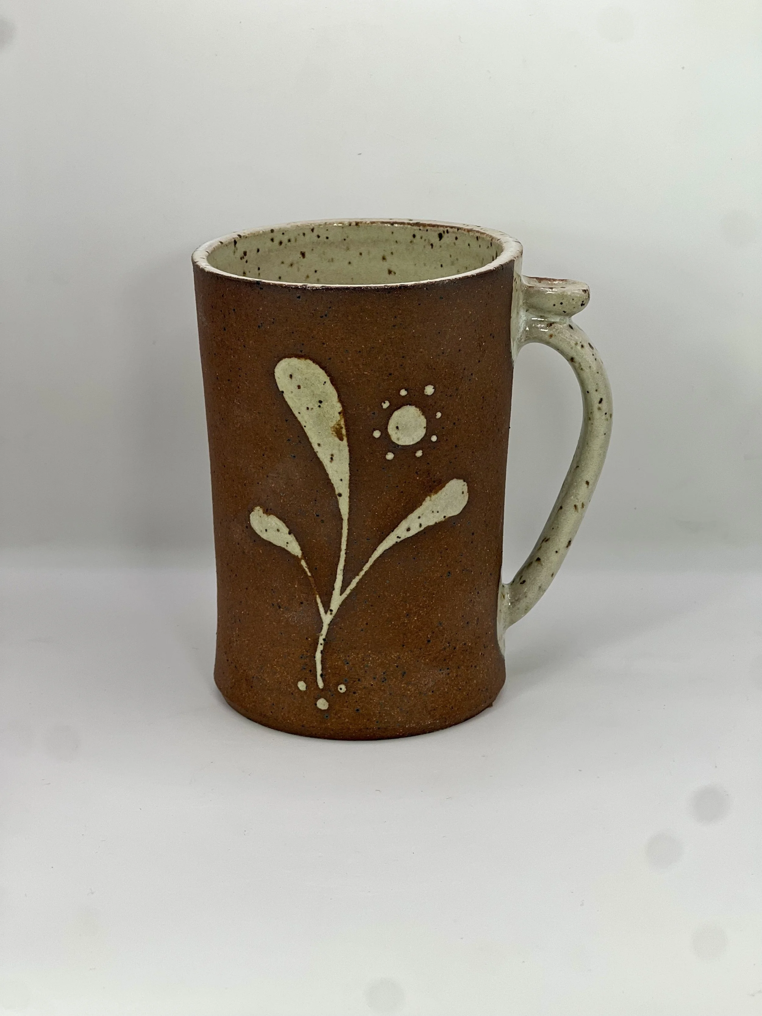 Wheel thrown and hand painted. This mug holds approximately 12 oz of liquid.