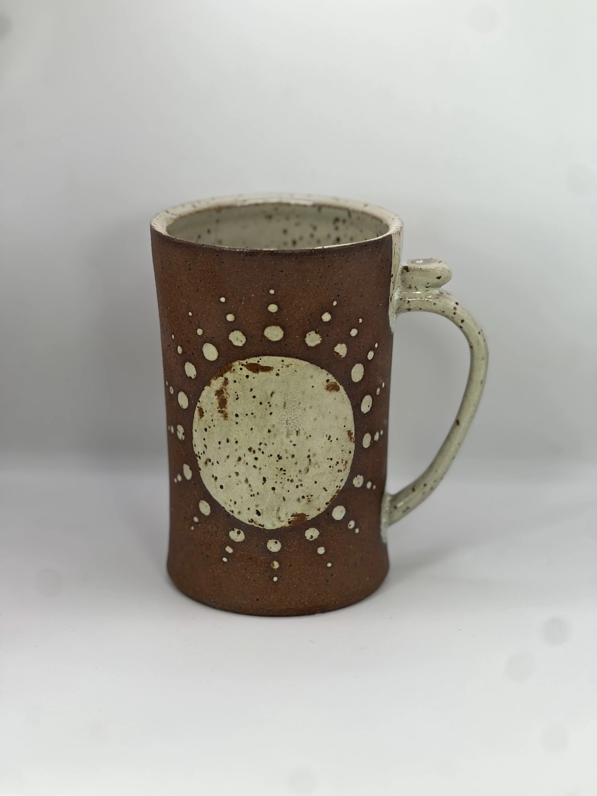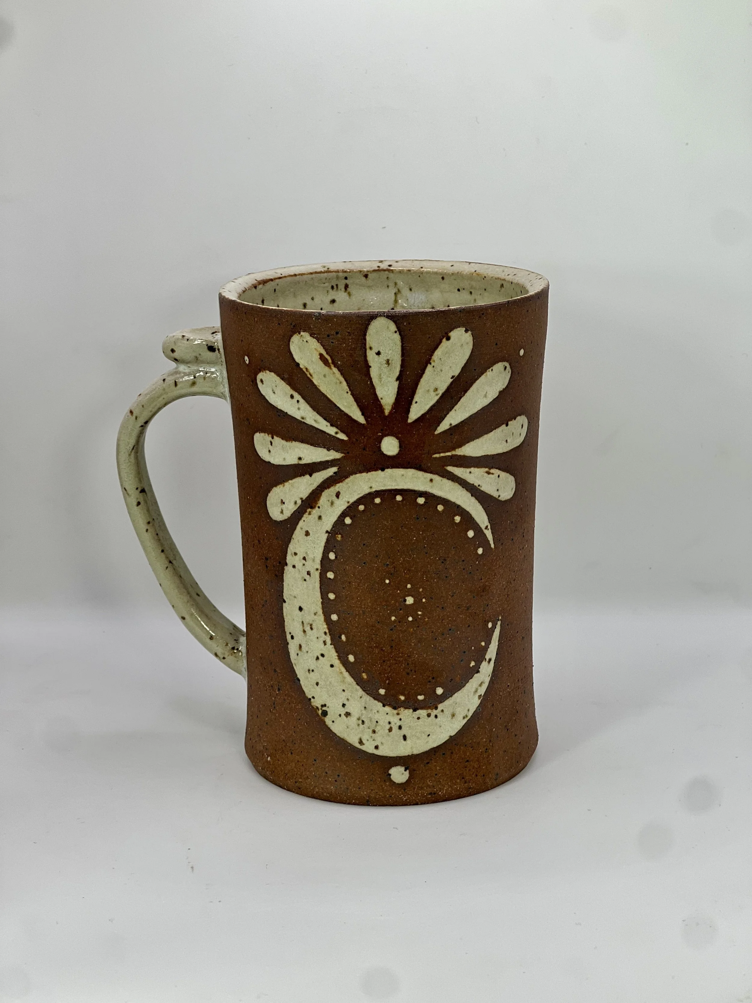Wheel thrown and hand painted. This mug holds approximately 14 oz of liquid.