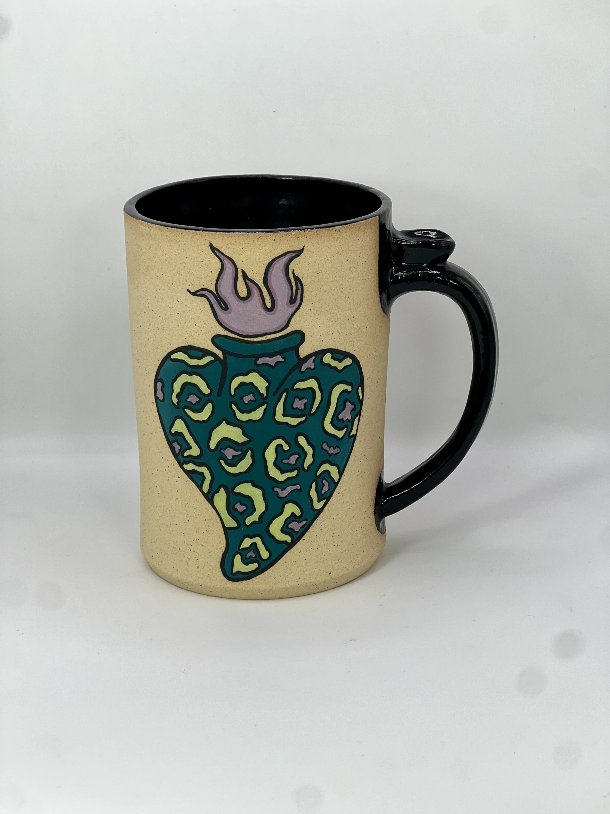 Wheel thrown and hand painted. This mug holds approximately 12 oz of liquid.
