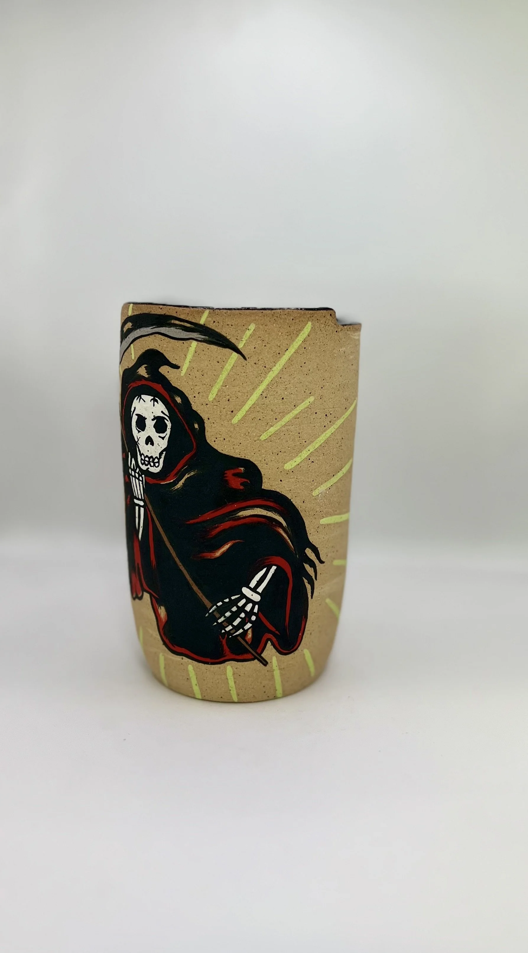 Wheel thrown and hand painted. This mug holds approximately 12 oz of liquid.