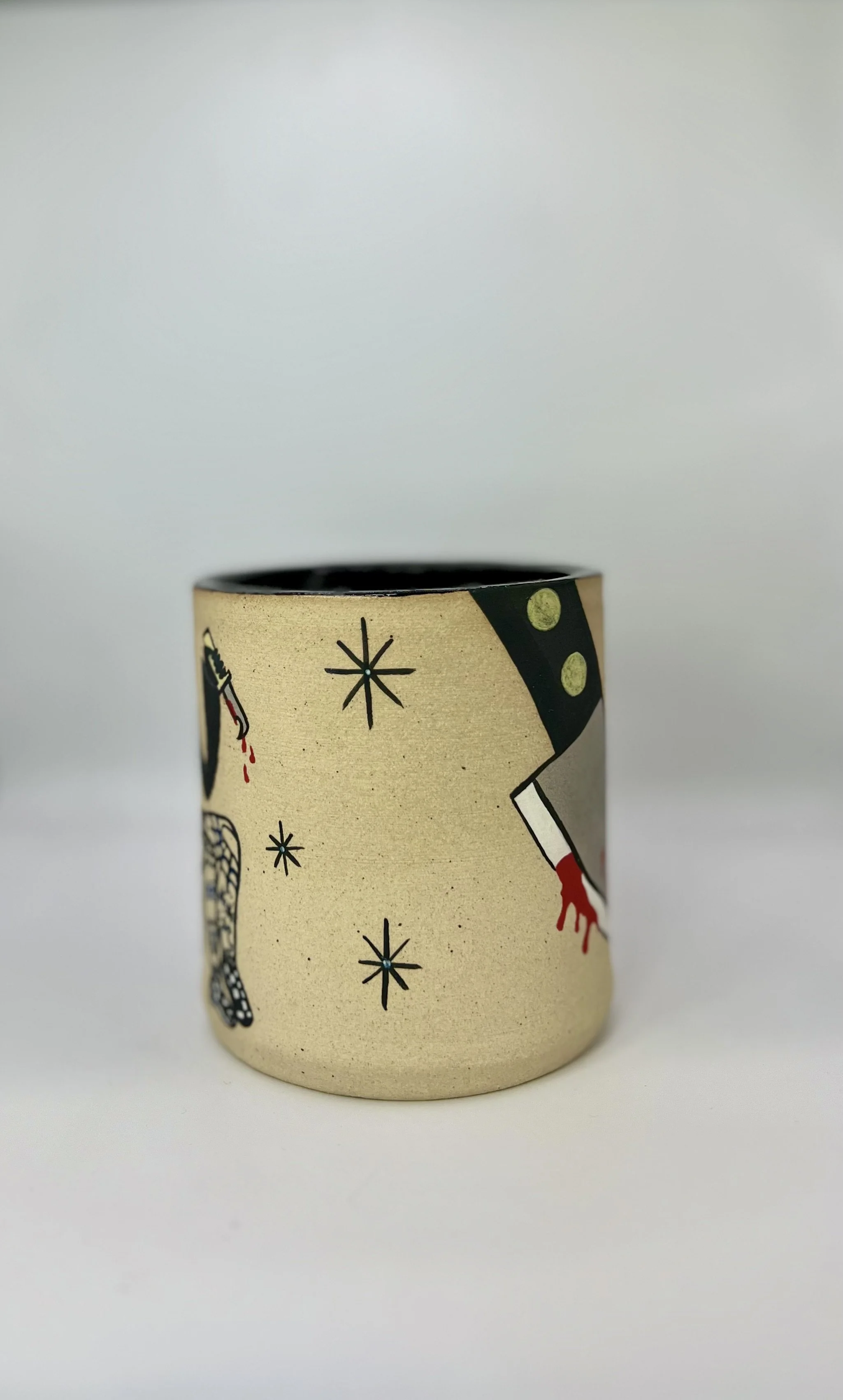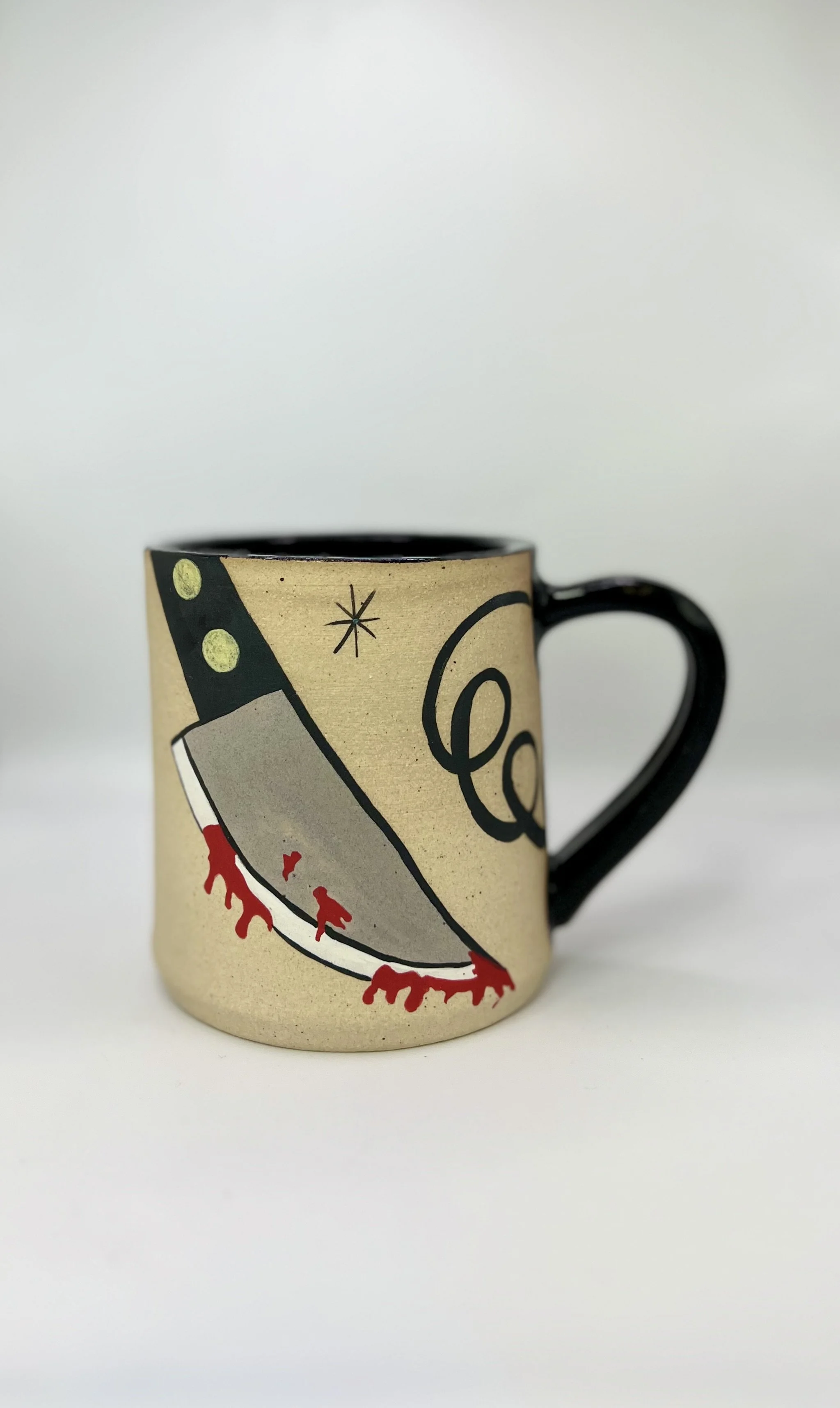 Wheel thrown and hand painted. This mug holds approximately 10 oz of liquid.