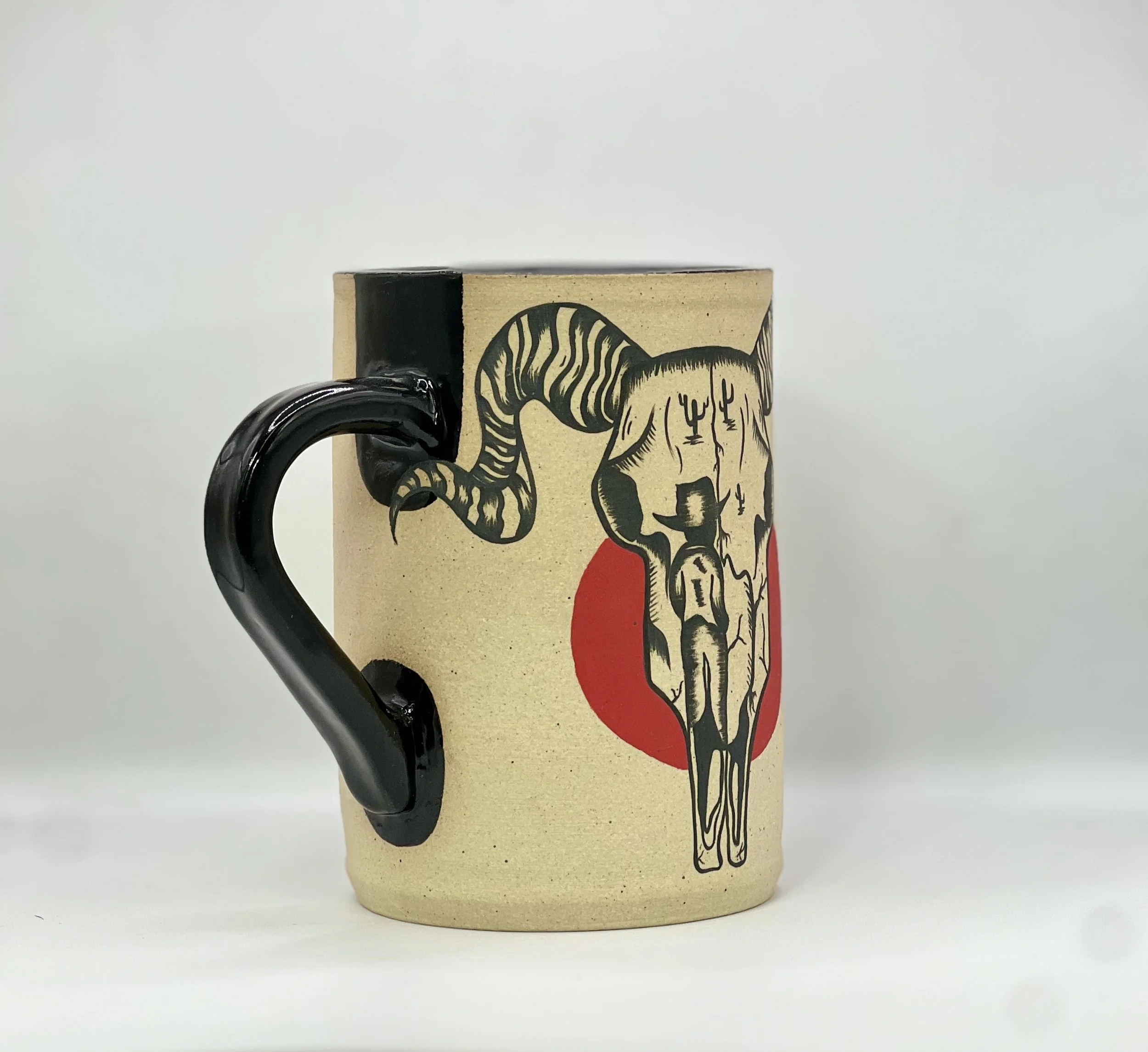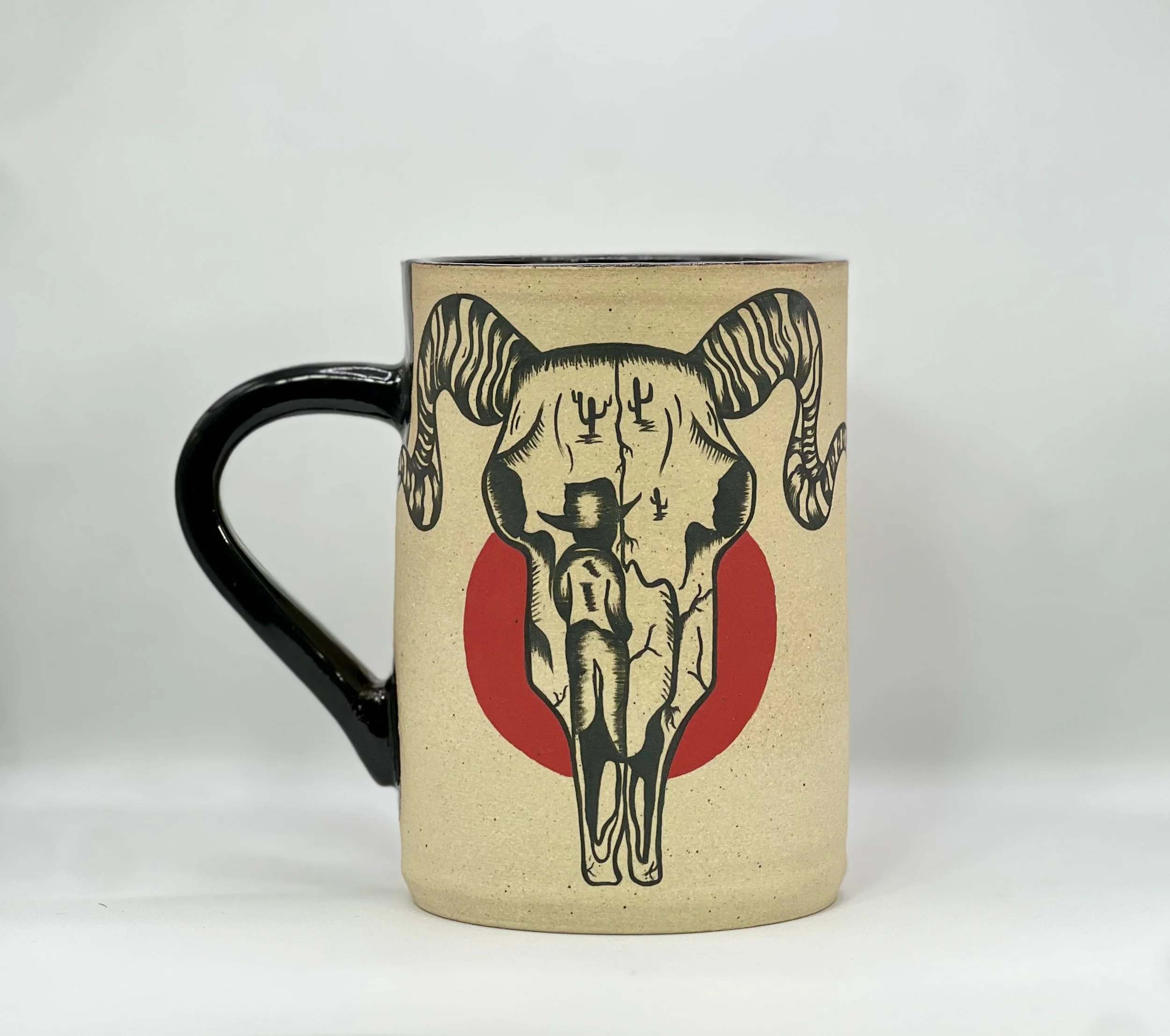Wheel thrown and hand painted. This extra tall mug holds approximately 16 oz of liquid.
