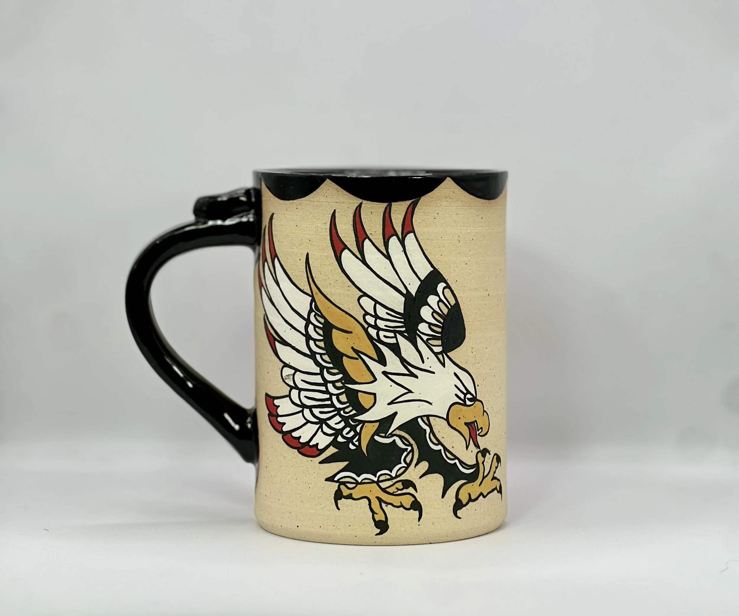 Wheel thrown and hand painted. This mug holds approximately 14 oz of liquid.