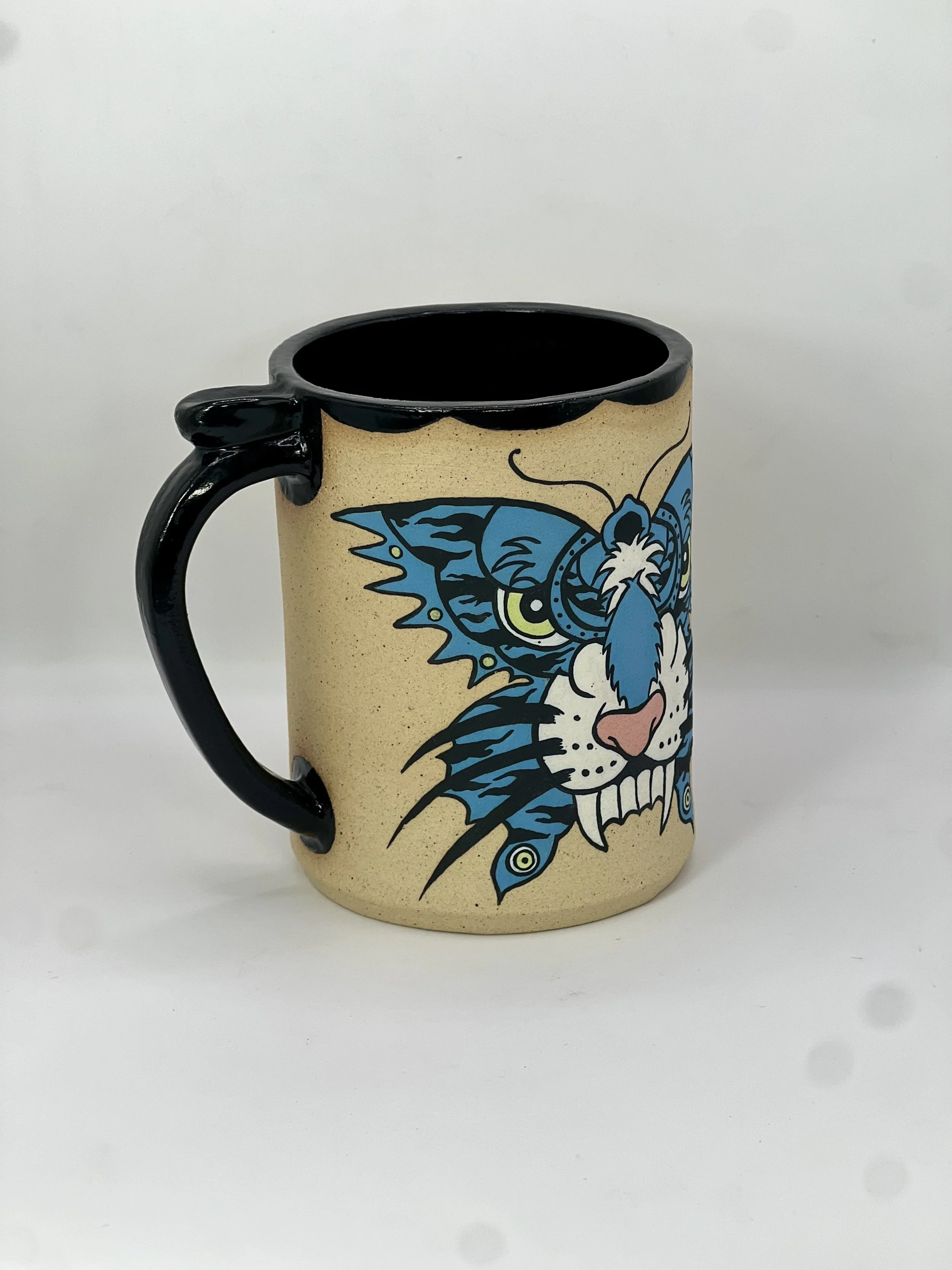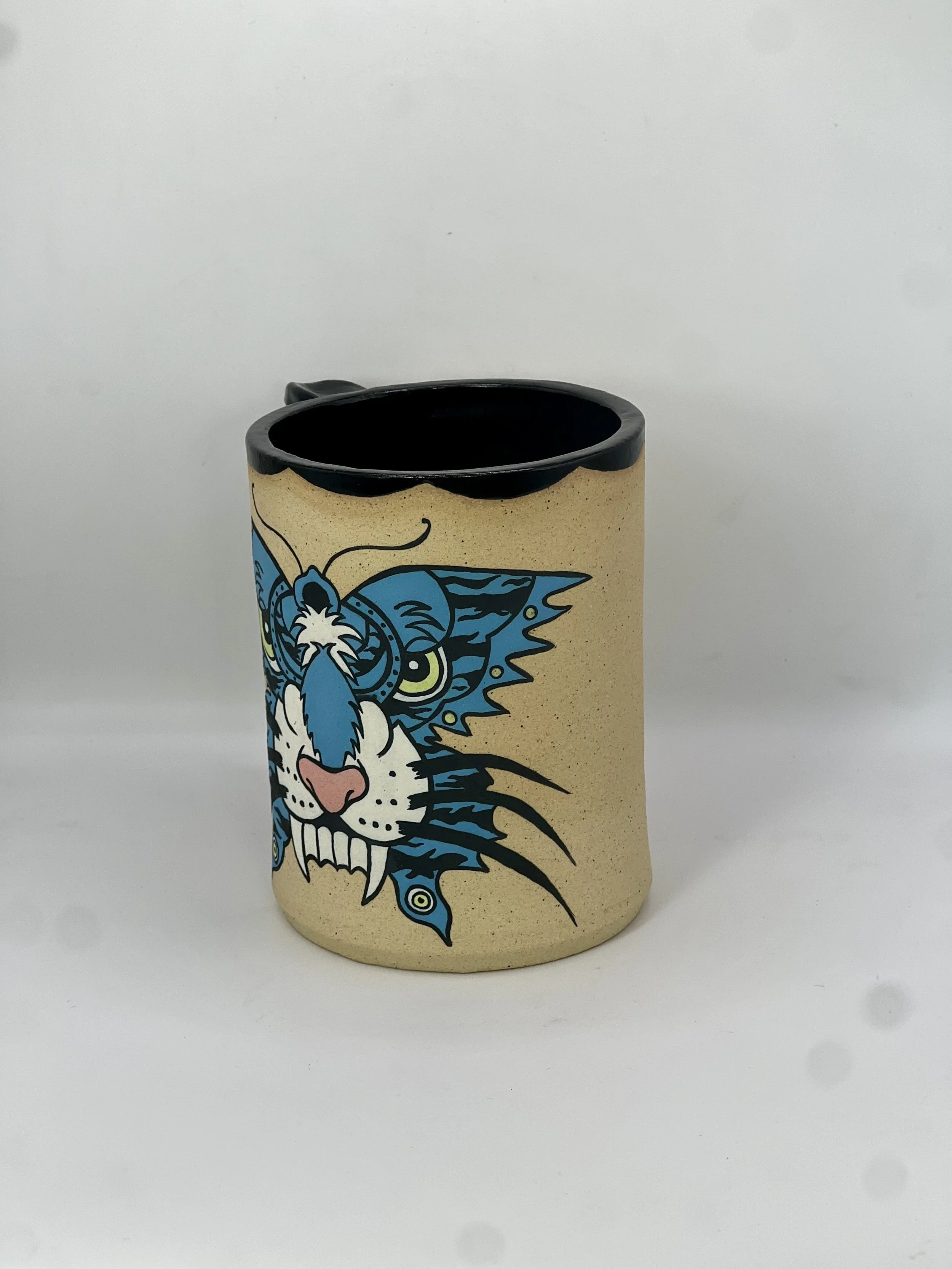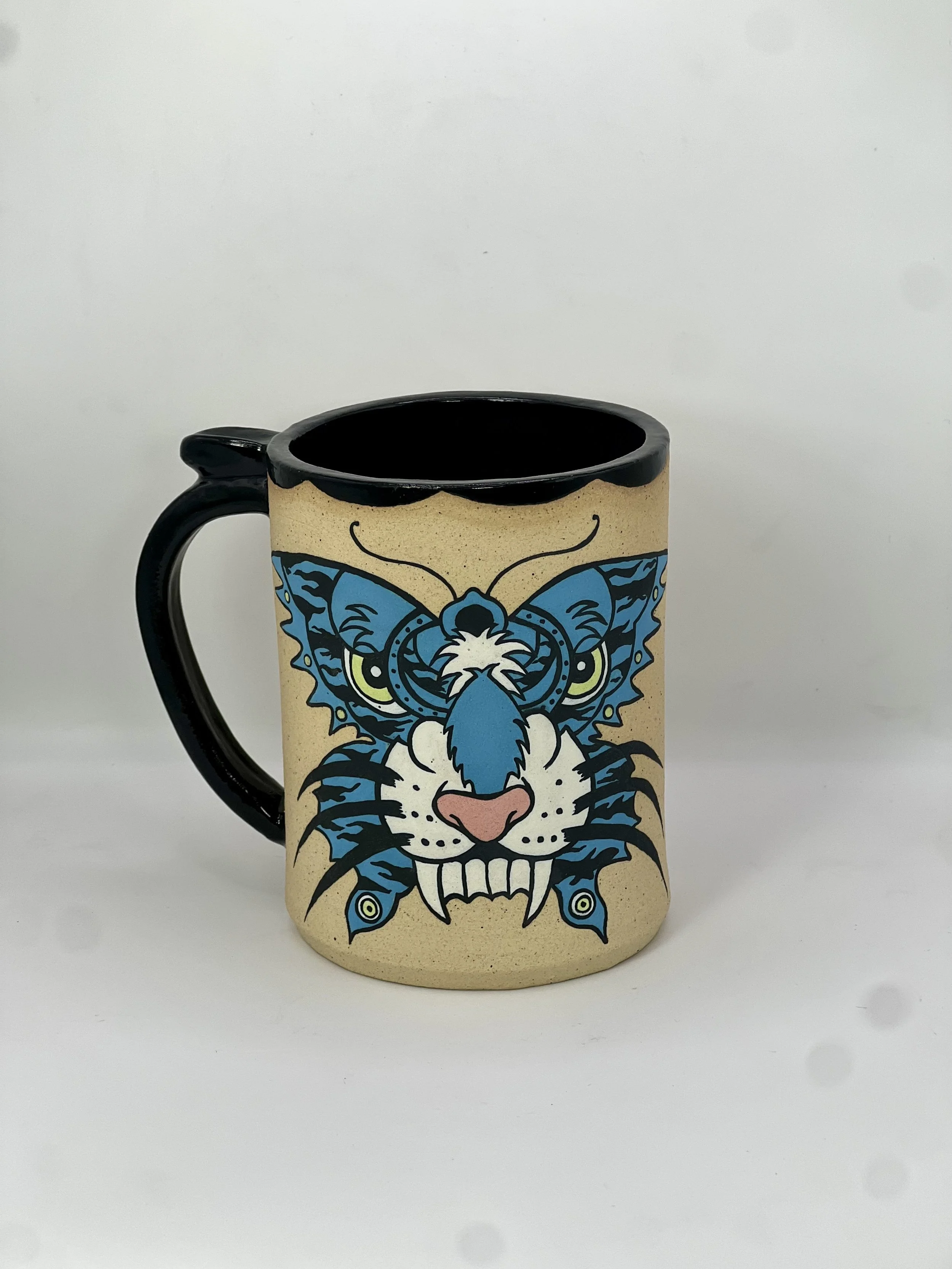 Wheel thrown and hand painted. This mug holds approximately 12 oz of liquid.