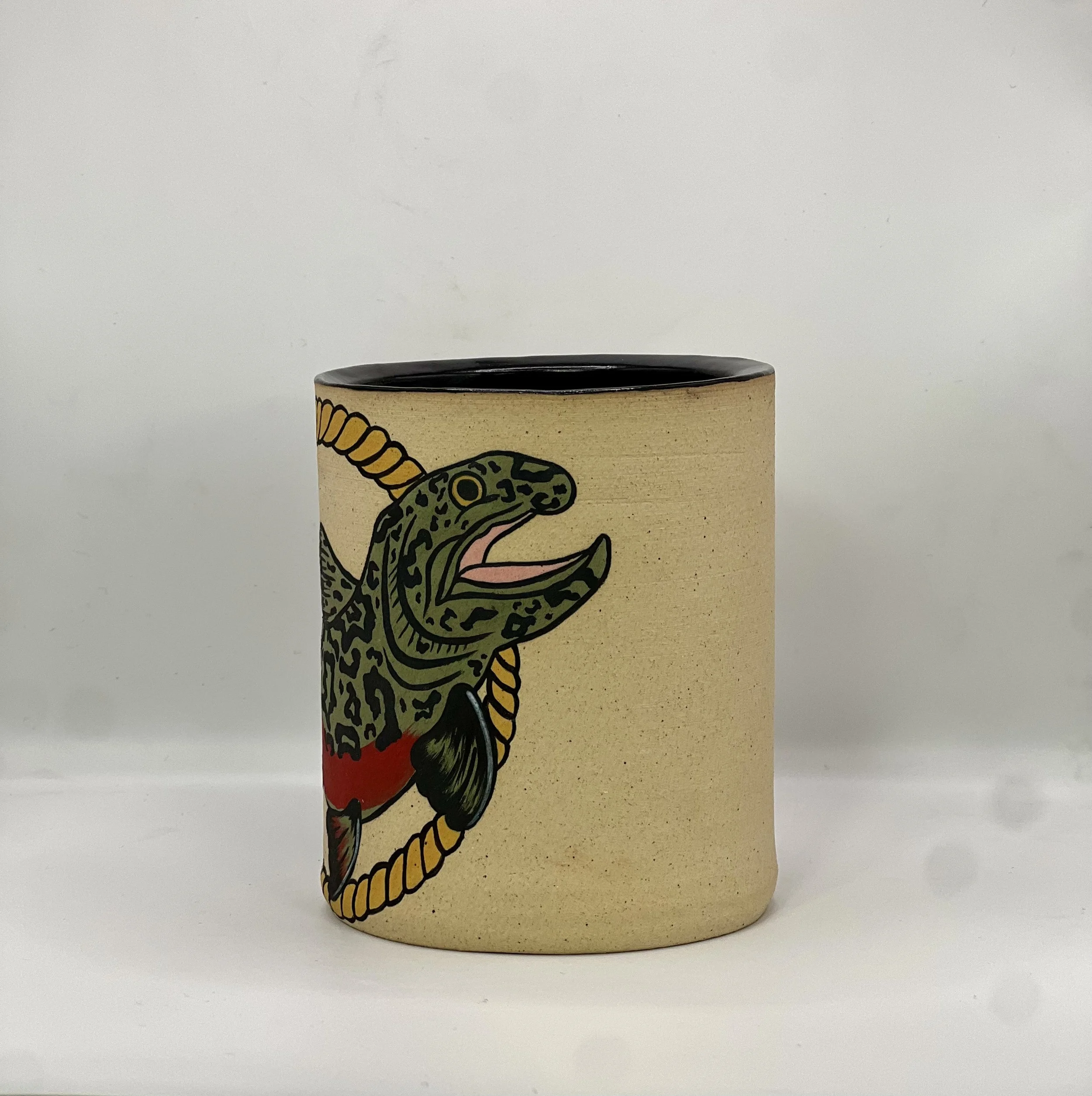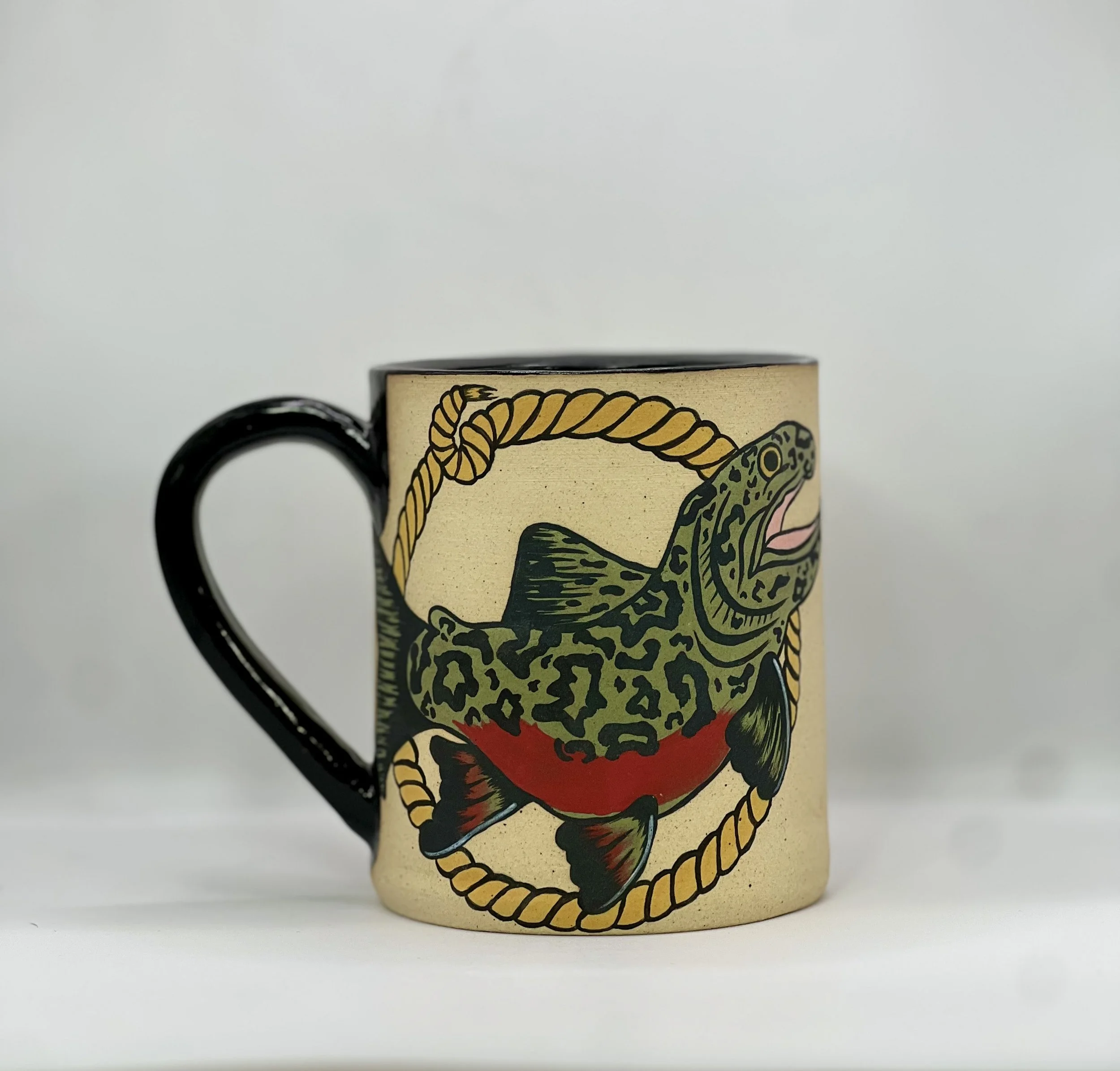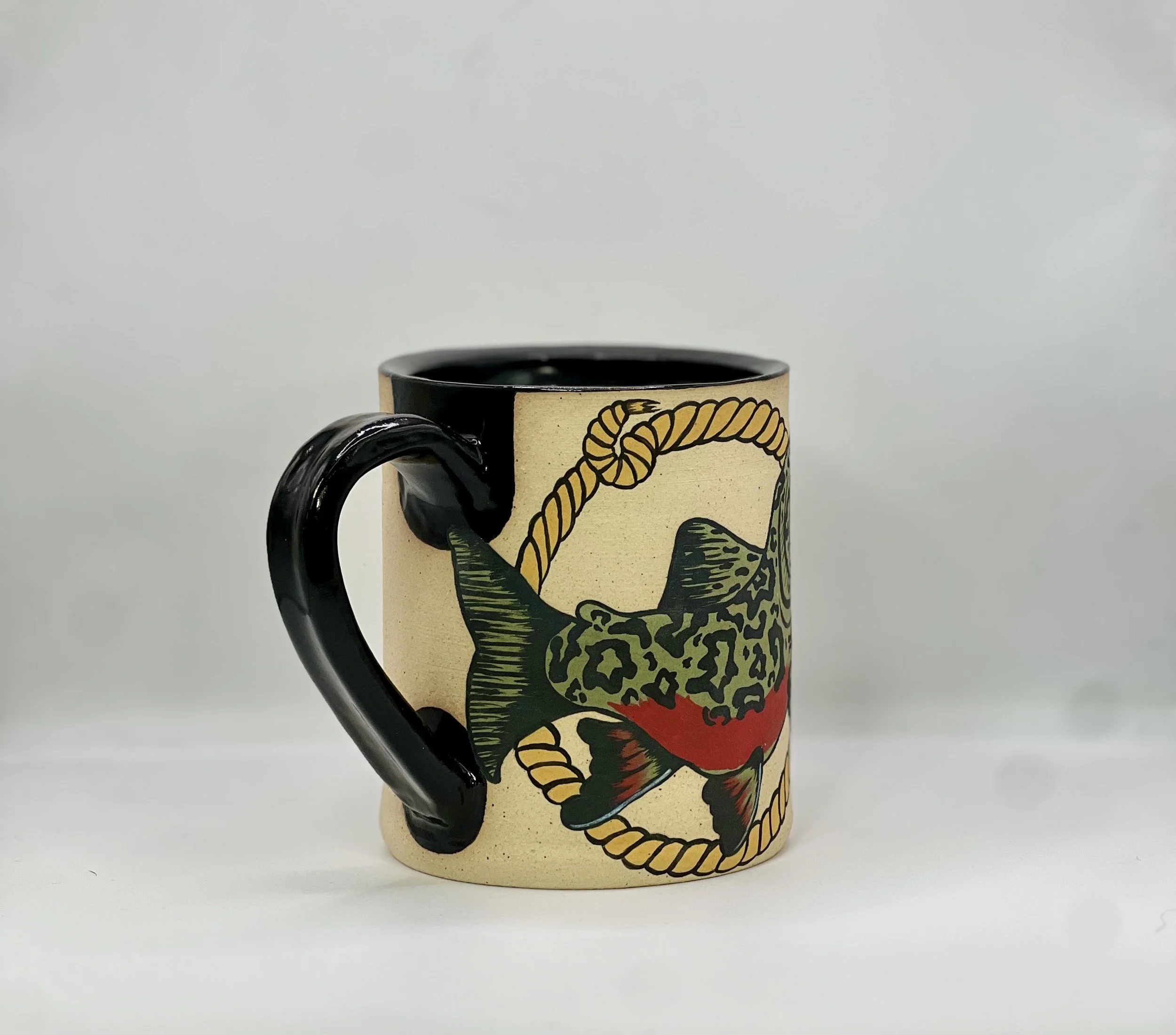 Wheel thrown and hand painted. This mug holds approximately 12 oz of liquid.